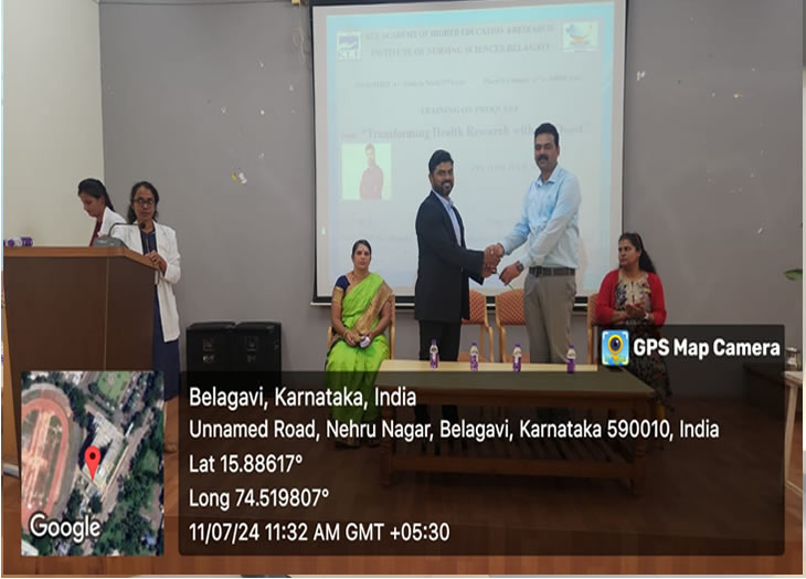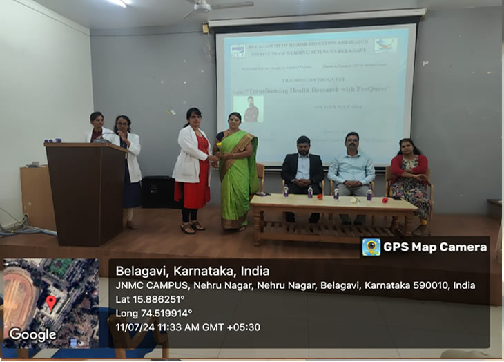 KLE Academy of Higher Education and Research Institute of Nursing Sciences in association with ProQuest organized a training programme on “Transforming Health Research with ProQuest”.On 11th July 2024.Introduction of the chief guest was carried out by Mrs. Surekha A. Hittanagi Librarian KAHER Institute of Nursing Sciences Belagavi. Dr. Veereshkumar S. Nandagaon Principal KAHER Institute of Nursing Sciences Belagavi. Spoke on the importance of usage of ProQuest. Mr. Srijith Sasidharan delivered the lecture on “Transforming Health Research with ProQuest”.All the teaching faculty, library staff & UG & PG students were present during the training programme Mrs. Surekha A. Hittanagi Librarain delivered the vote of thanks.